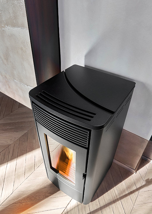 Печь малой мощности (6 кВт) с принудительной вентиляцией. Он имеет чугунную столешницу и окрашенные стальные стенки (бордо, белый, темный, серебристый). Интеллектуальное управление горением с Maestro.
