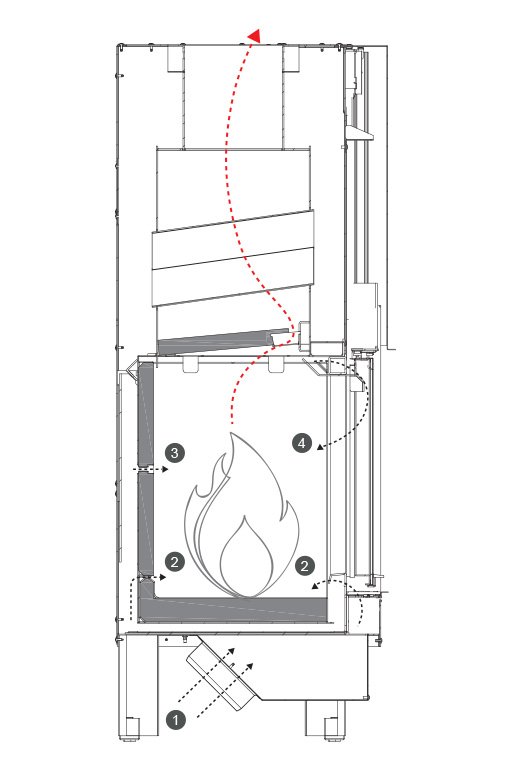 Входные отверстия для воздуха для горения и очистки стекла могут быть полностью выведены наружу, таким образом изолируя дымоход от окружающей среды, в которой производится установка.