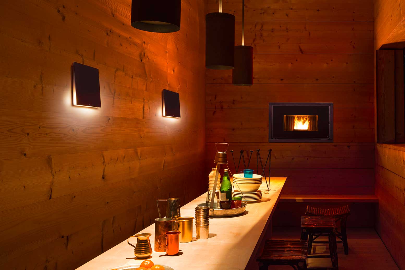 Канальный камин на гранулах с большим обзором. Мангал и топка из черного чугуна. Интеллектуальное управление горением с технологией Maestro и двойным Wi-Fi. Он подходит для нескольких облицовок из каталога, в том числе Sahara , облицовки камина, разработанной Паолой Навоне для MCZ.