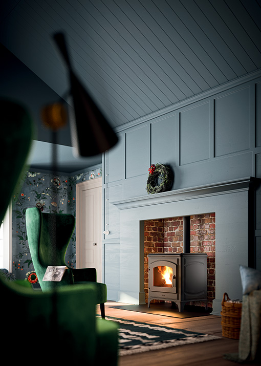 Пеллетная печь в классическом стиле с облицовкой и топкой полностью из чугуна черного цвета. Герметичная конструкция и интеллектуальное управление горения с технологией Maestro и двойным Wi-Fi в комплекте (Decò Air 8 M1) или с Active + (Decò Air 8 H1).