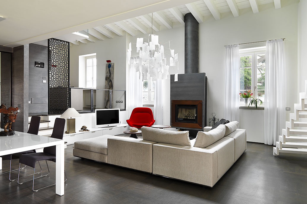 В существующем доме уже был дровяной камин с закрытой камерой, полностью функциональный, который затем был пересмотрен только с точки зрения его внешнего вида, чтобы он вписался в новый контекст. Для новой облицовки мы выбрали довольно индивидуальный стиль, даже несколько индустриальный.